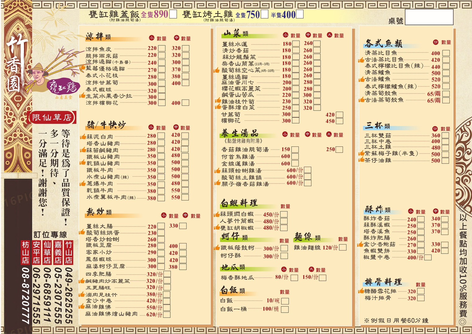 竹香園招牌必點甕缸雞,現炒料理,山產美食、水蓮、檳榔花。