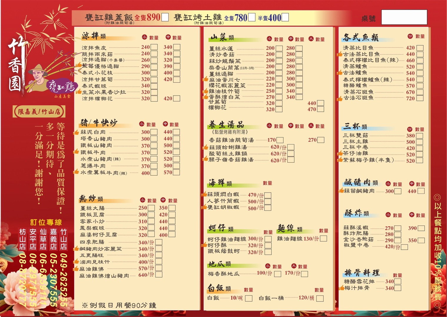竹香園招牌必點甕缸雞,現炒料理,山產美食、水蓮、檳榔花。