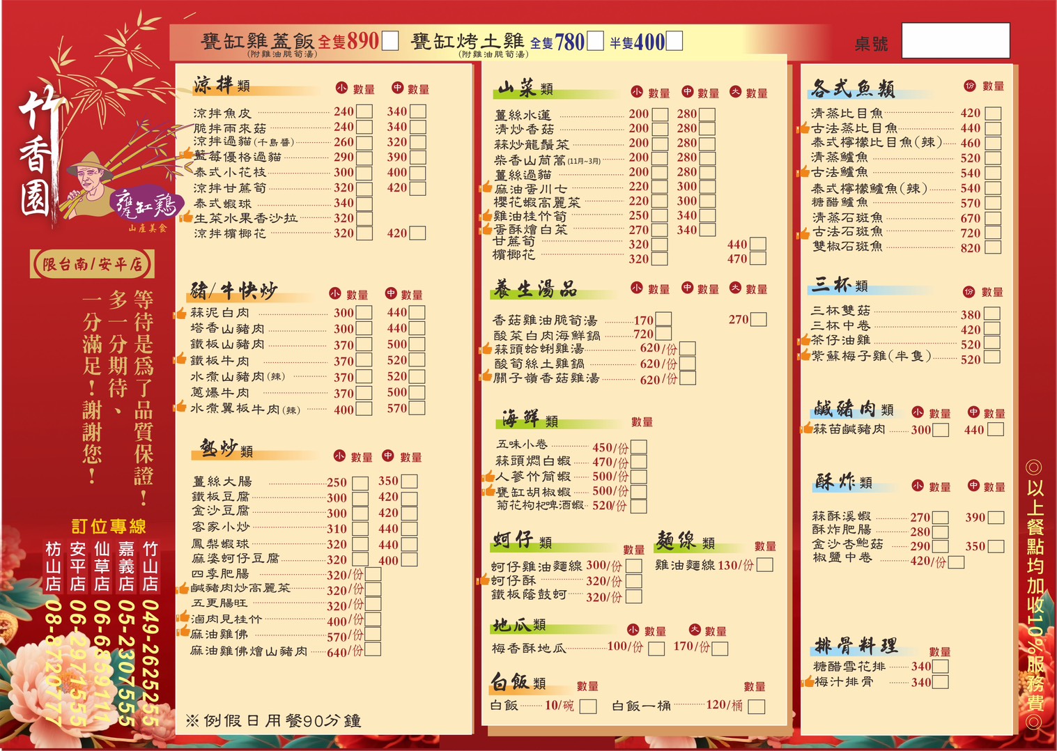竹香園招牌必點甕缸雞,現炒料理,山產美食、水蓮、檳榔花。