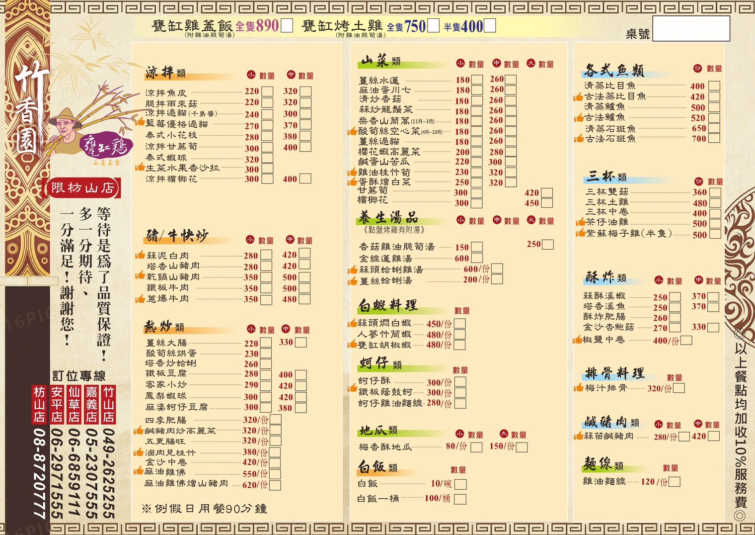 竹香園招牌必點甕缸雞,現炒料理,山產美食、水蓮、檳榔花。